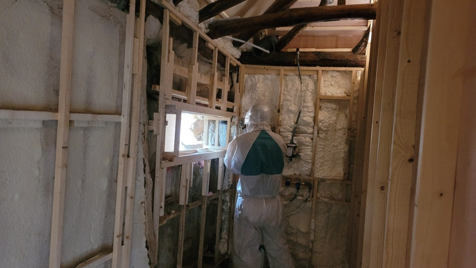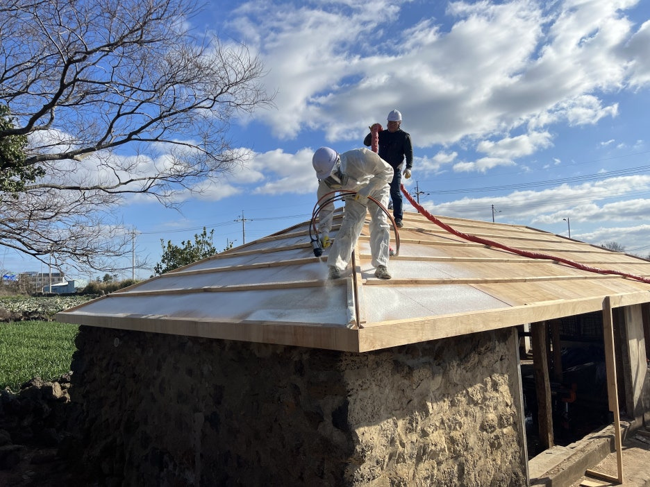 우레탄폼 작업을 한 후 다시 합판으로 감싸고 방수시트 작업으로 이중 단열로 틈새를 모두다 막아버렸다.