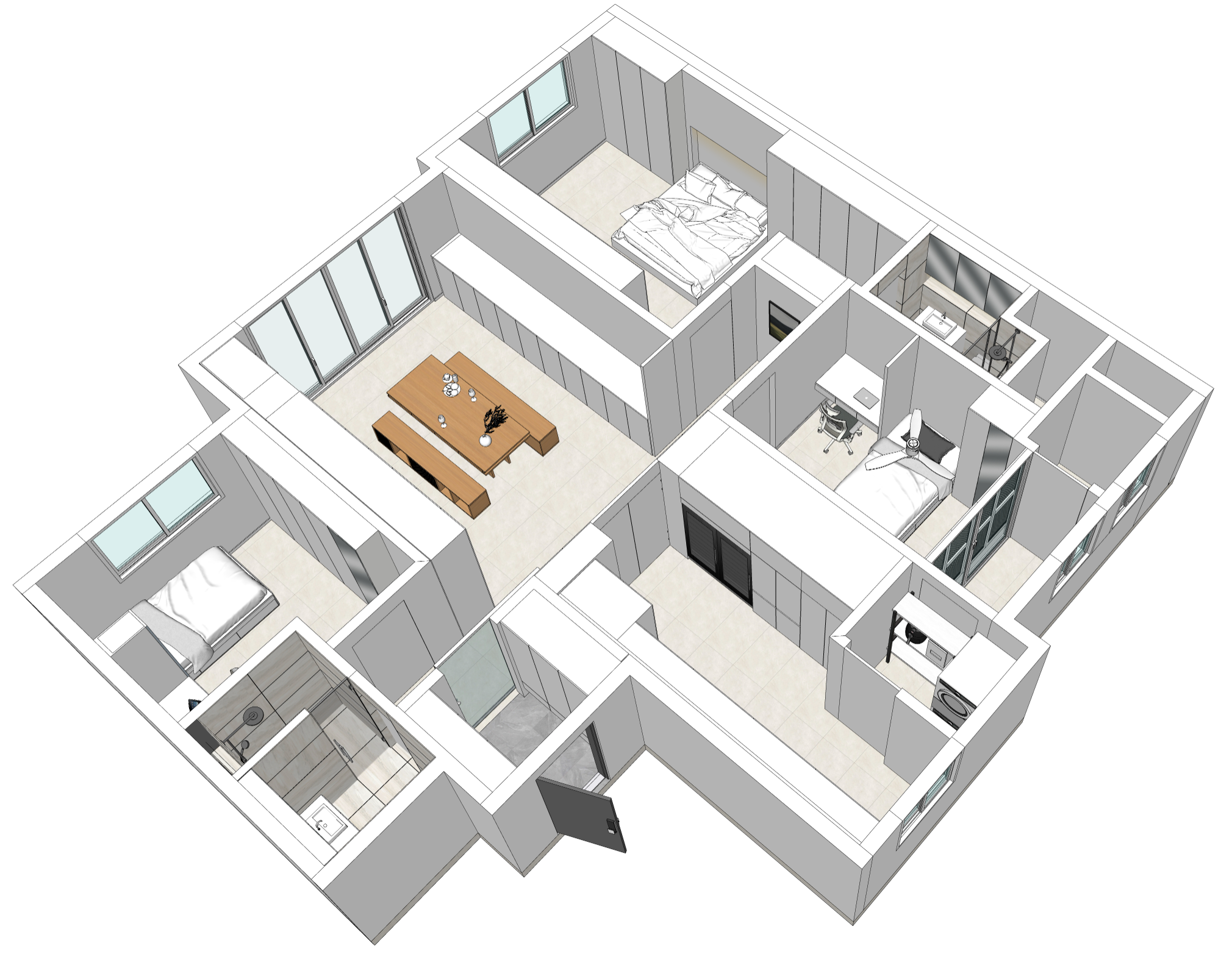 주신 도면을 바탕으로 아이소 작업을 진행해 보았습니다. 깨끗한 화이트톤의 전면 붙박이 장과 고양이를 위한 공간이 이번 프로젝트의 중요한 포인트가 아닐까 싶습니다.