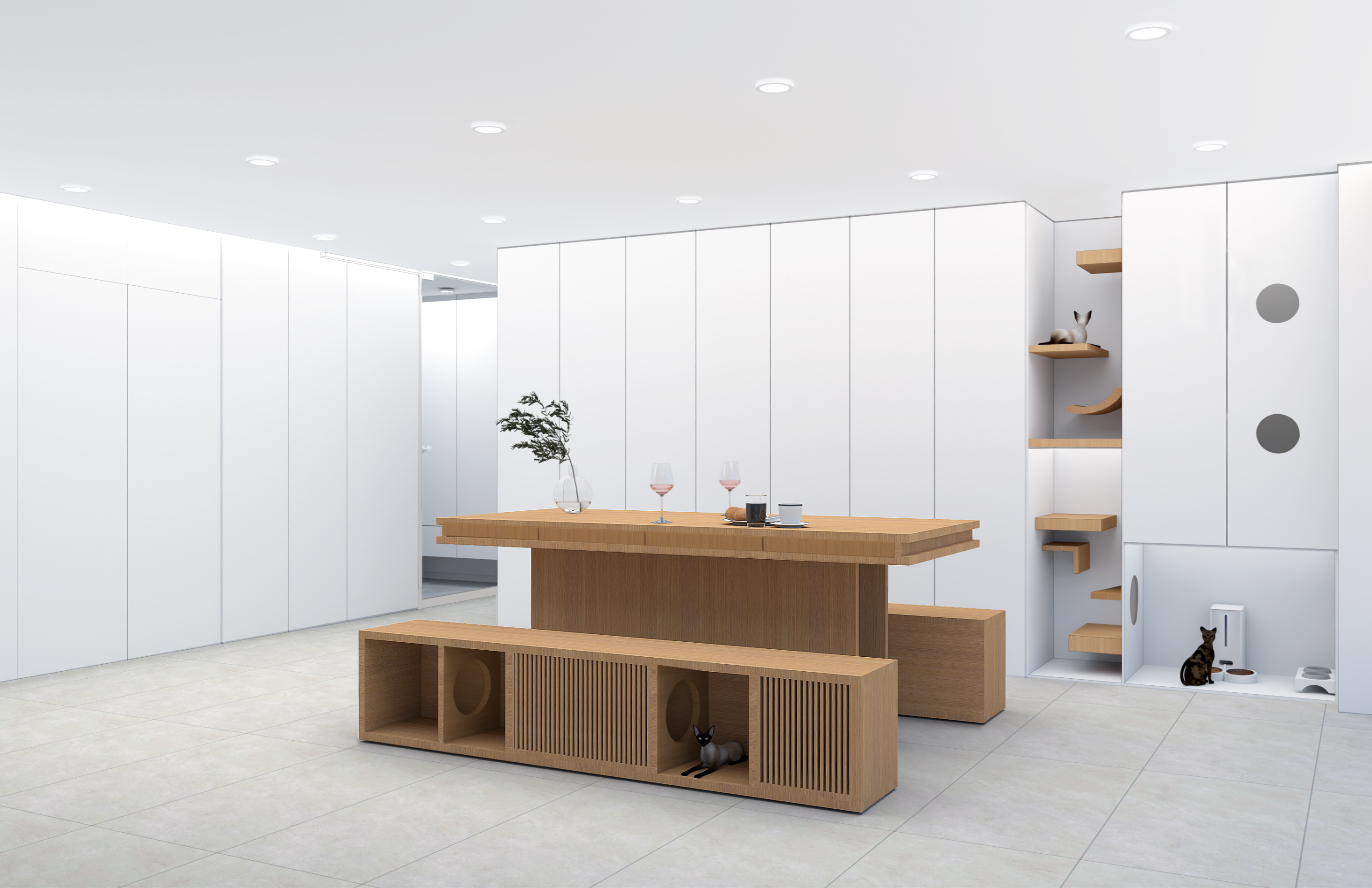 붙박이장과 캣타워를 결합하여, 고양이가 편안하게 쉴 수 있는 아늑한 공간을 제공하면서도, 실내 인테리어의 조화를 해치지 않는 디자인을 구상해 봤습니다. 캣타워 옆에는 고양이 용품을 수납할 수 있는 공간을, 하부에는 고양이의 식사 공간을 마련하여 실용성을 더했습니다.