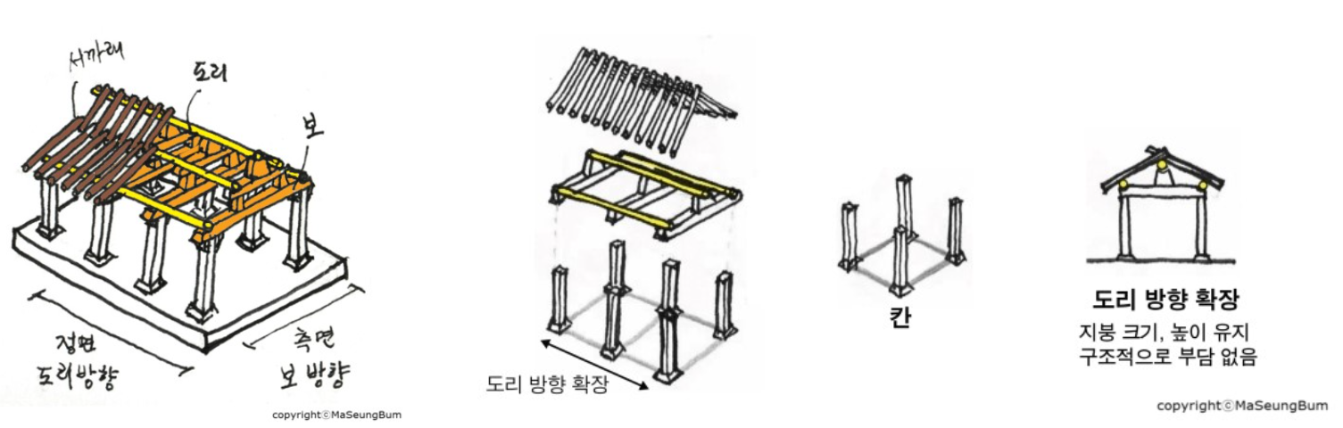 이때 우리가 정면이라고 부르는 방향을 '도리방향' 이라고 부르고,